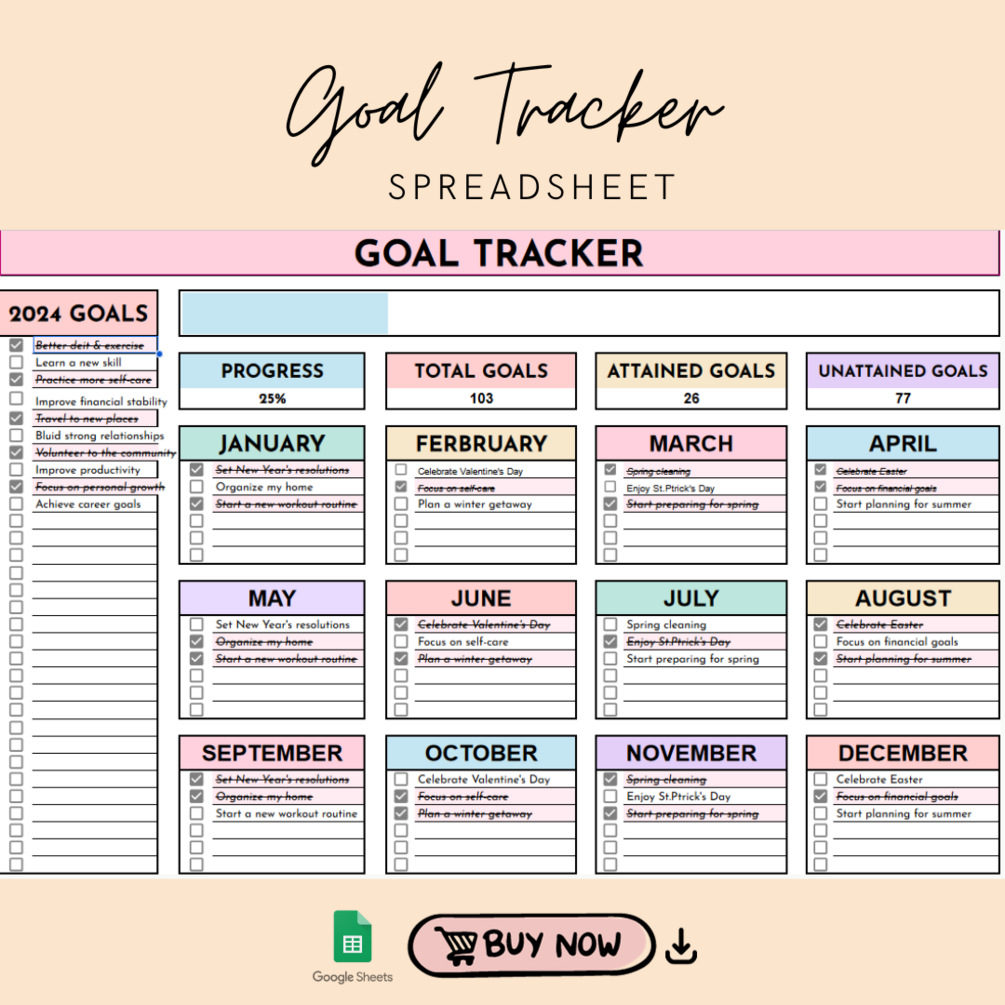 The Goal Tracker Spreadsheet is an amazing tool that's been designed to help you achieve your goals and keep track of your progress over time. It's like having a personal assistant right at your fingertips! By using our goal tracker spreadsheet, you can gain valuable insights about your strengths and weaknesses, allowing you to identify areas where you need to improve. It's a powerful way to stay motivated as you work towards your goals, whether they're short-term or long-term. No matter what you're aiming for, our goal tracker spreadsheet is the perfect solution to help you stay on track and find success in every area of your life. It's time to say goodbye to feeling overwhelmed and hello to a more focused and organized approach to reaching your goals!
